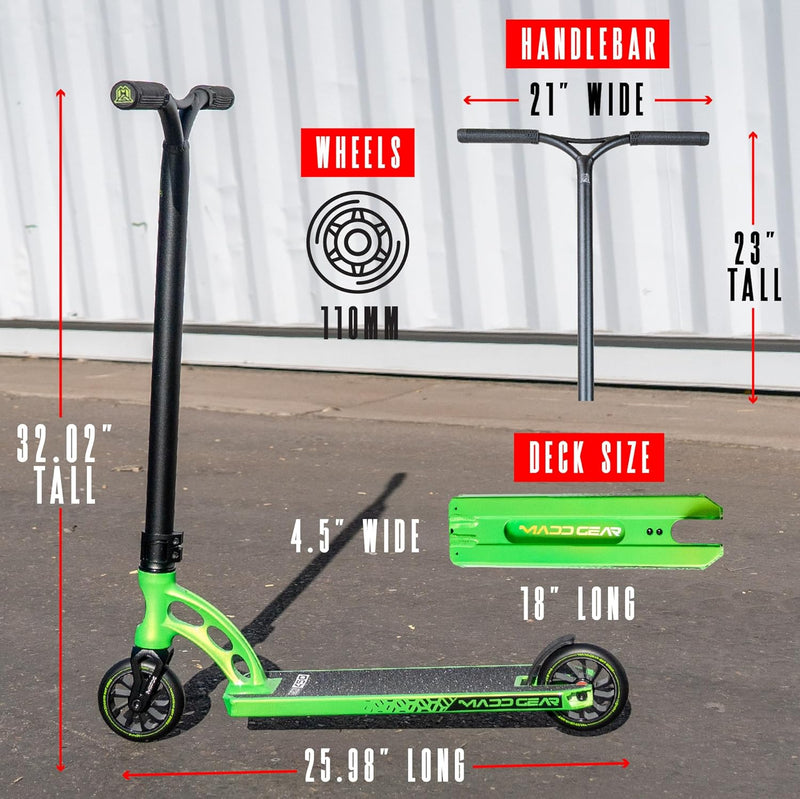 הסקוט כולל משטח דריכה (DECK) באורך 17.5 אינץ’, ורוחב של 4.5 אינץ’, מה שיוצר פלטפורמה מוצקה לנחיתה של הטריקים שלך. הכידון פרופורציונלי שיהיה נוח ברוחב 21 אינץ’ ובגובה 23 אינץ’ ומאפשר התקדמות קלה ויכולת נסיעה ושליטה מעולים.